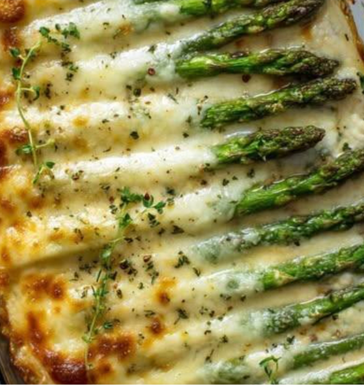 2 bunches of asparagus1 tablespoon butter1/2 ounce soft cream cheese1/2 cup heavy whipping cream1 tablespoon chicken broth1/4 teaspoon Italian seasoning1/2 teaspoon garlic powder1/4 teaspoon paprika1/8 teaspoon salt1/8 teaspoon pepper1/3 cup grated parmesan cheese1/8 cup Pepper Jack cheese, shredded1/2 teaspoon red pepper flakes1/3 cup cooked and crumbled baconDirections:Heat the oven to 400 degrees. – Wash and trim the asparagus, then grease a 9 x 13 baking tray and place them in it.